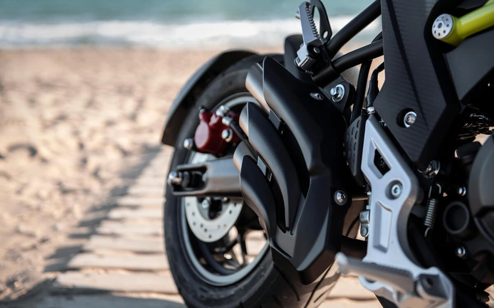 Para el sistema de frenos, MACBOR recurre a un disco delantero de 200 mm. de diámetro con pinza flotante de tres pistones y a un disco trasero de 190 mm. con pinza flotante monopistón. El trabajo de ambos discos queda asociado gracias a la tecnología CBS. El conjunto lo cierran los neumáticos tan característicos de estas pequeña naked, ya que ambos montan una llanta de 14 pulgadas.